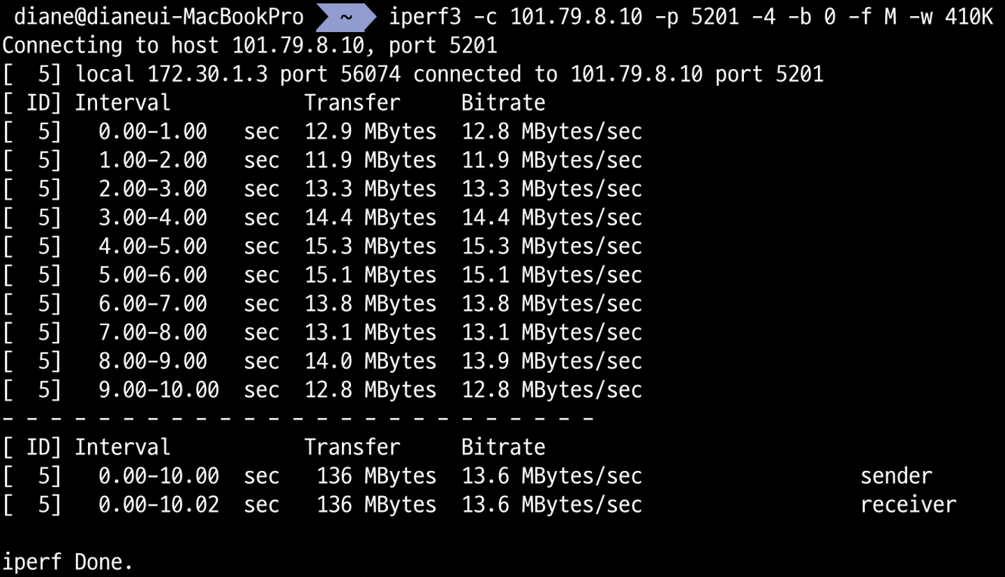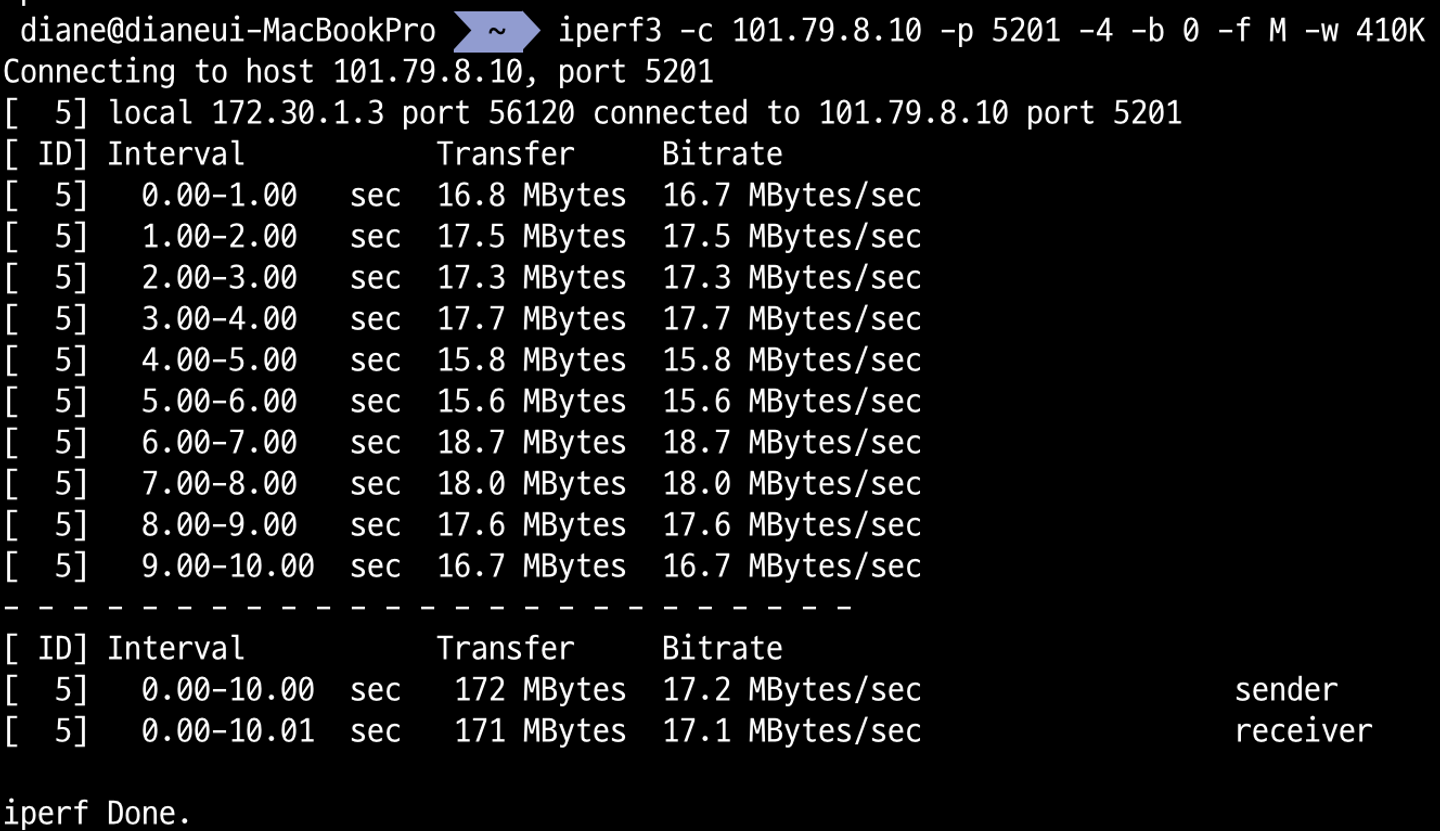 iperf3 -c 101.79.8.10 -p 5201 -4 -b 0 -f M -w 410K