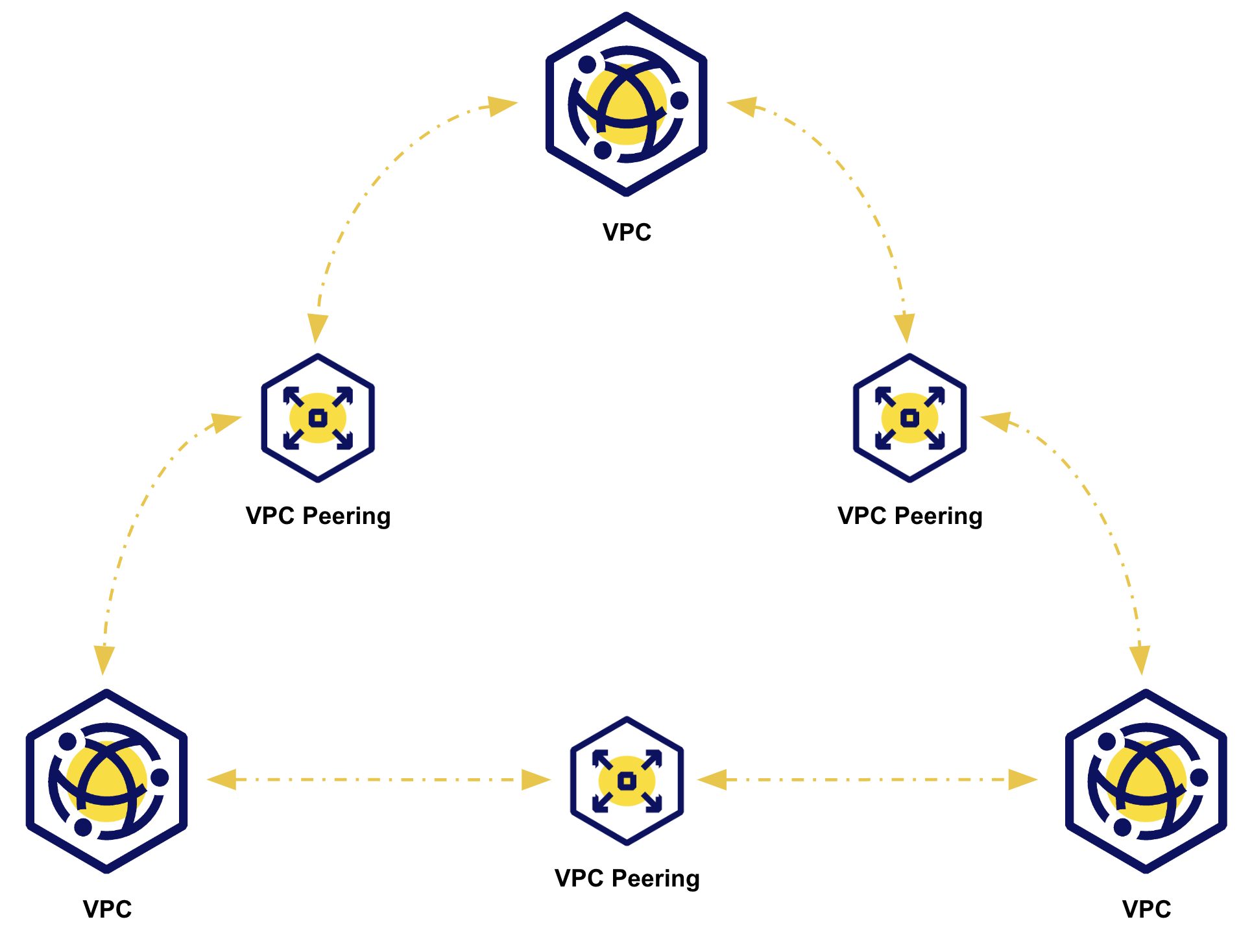 아래와 같이 3개의 VPC를 NCP의 VPC Peering을 통해 연결했다.