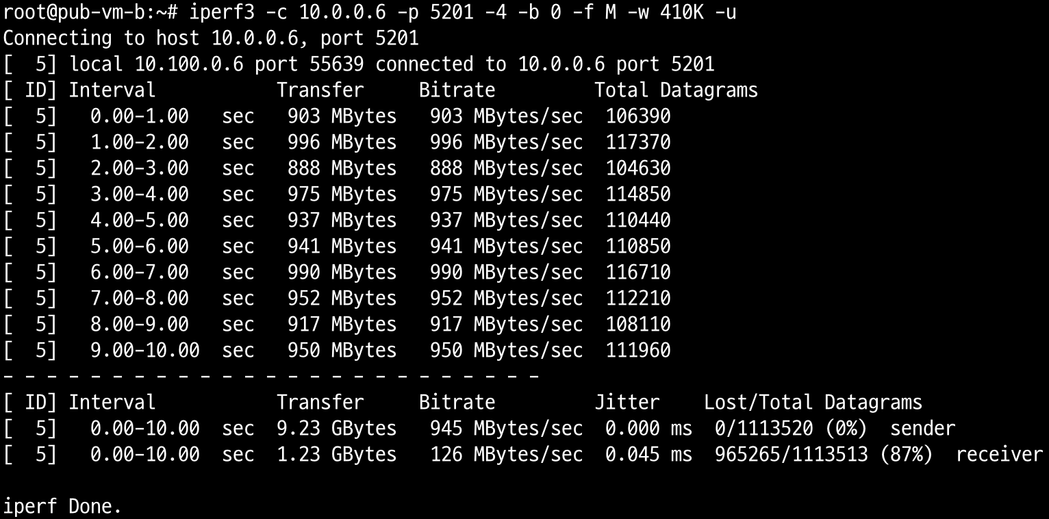 iperf3 -c 10.0.0.6 -p 5201 -4 -b 0 -f M -w 410K -u