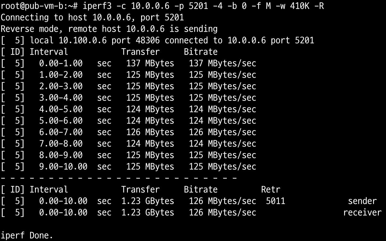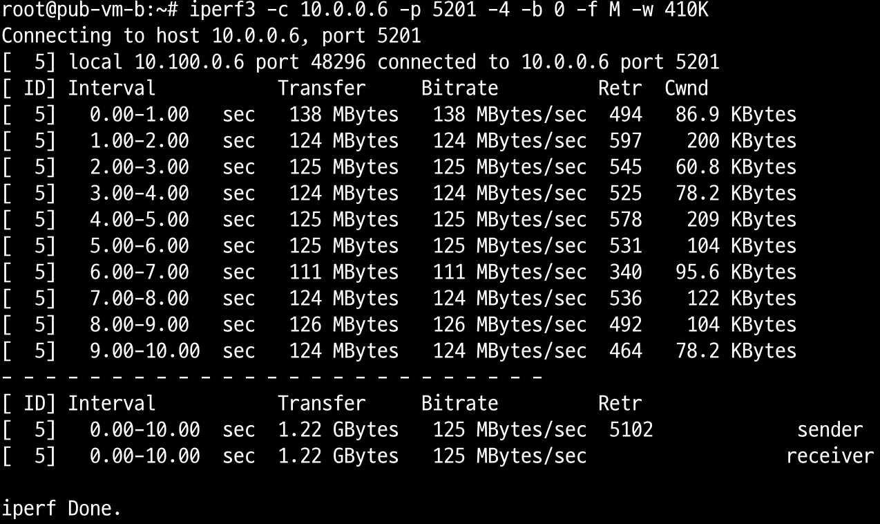 iperf3 -c 10.0.0.6 -p 5201 -4 -b 0 -f M -w 410K