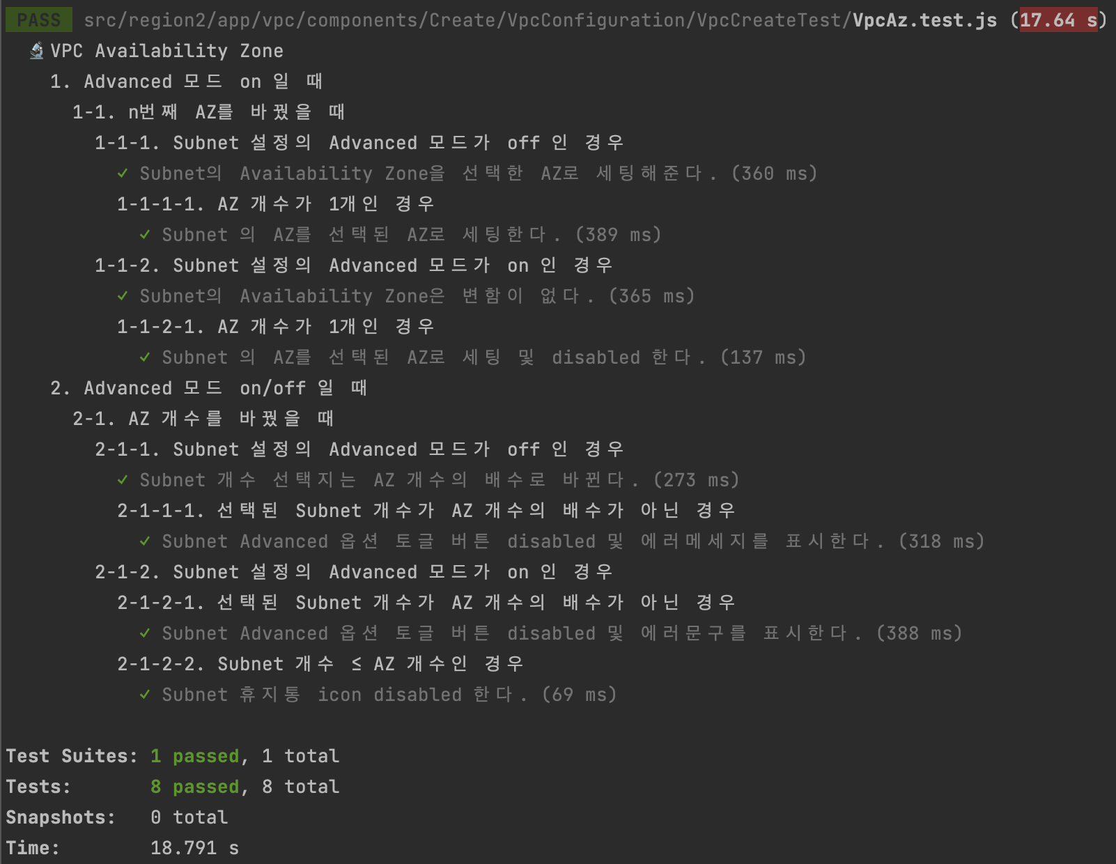 유저 이벤트에 대한 테스트 코드를 작성했기 때문에, 'jest test' 한 번으로 리팩토링한 코드를 점검할 수 있다.