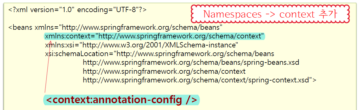 자동 주입 대상에 @Autowired사용 + XML설정에 context:annotation-config/추가
