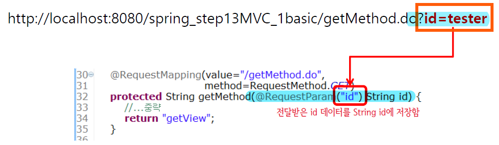 - @RequestParam : HTTP요청에 포함된 파라미터 참조 시 사용