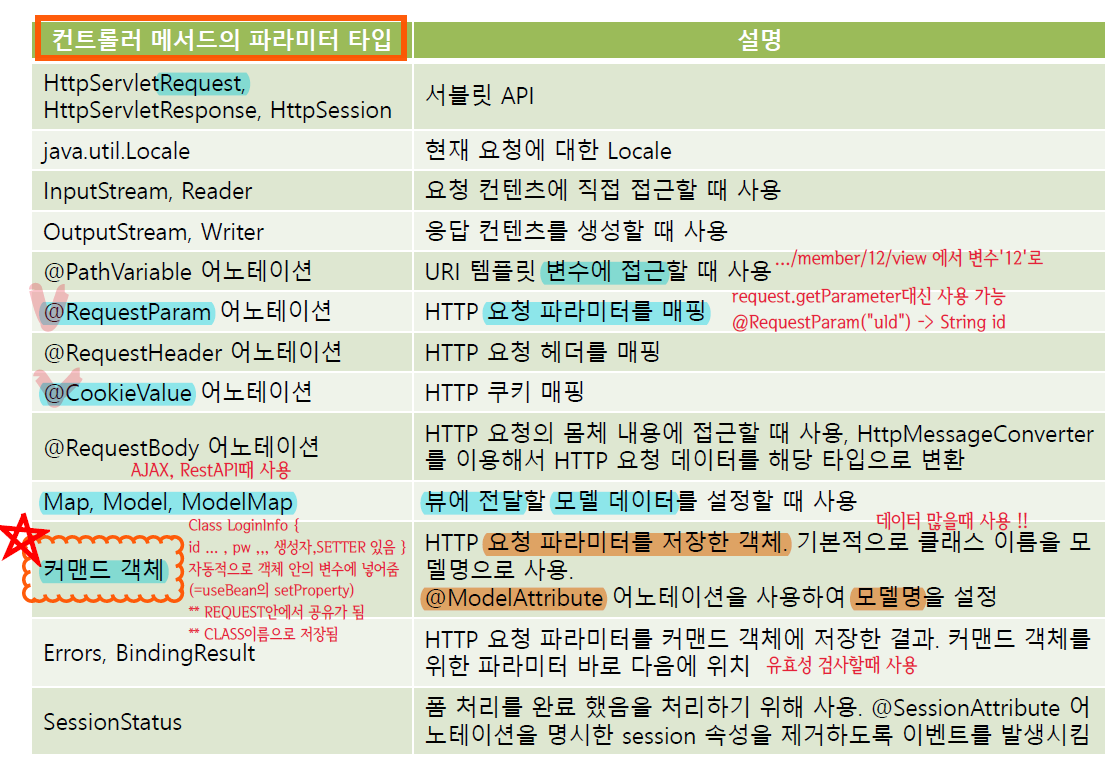 - HTML폼에 입력한 데이터 → 자바 빈 객체로 전달 ⇒ @RequestMapping이 적용된 메소드의 파라미터로 자바빈 타입 추가 설정