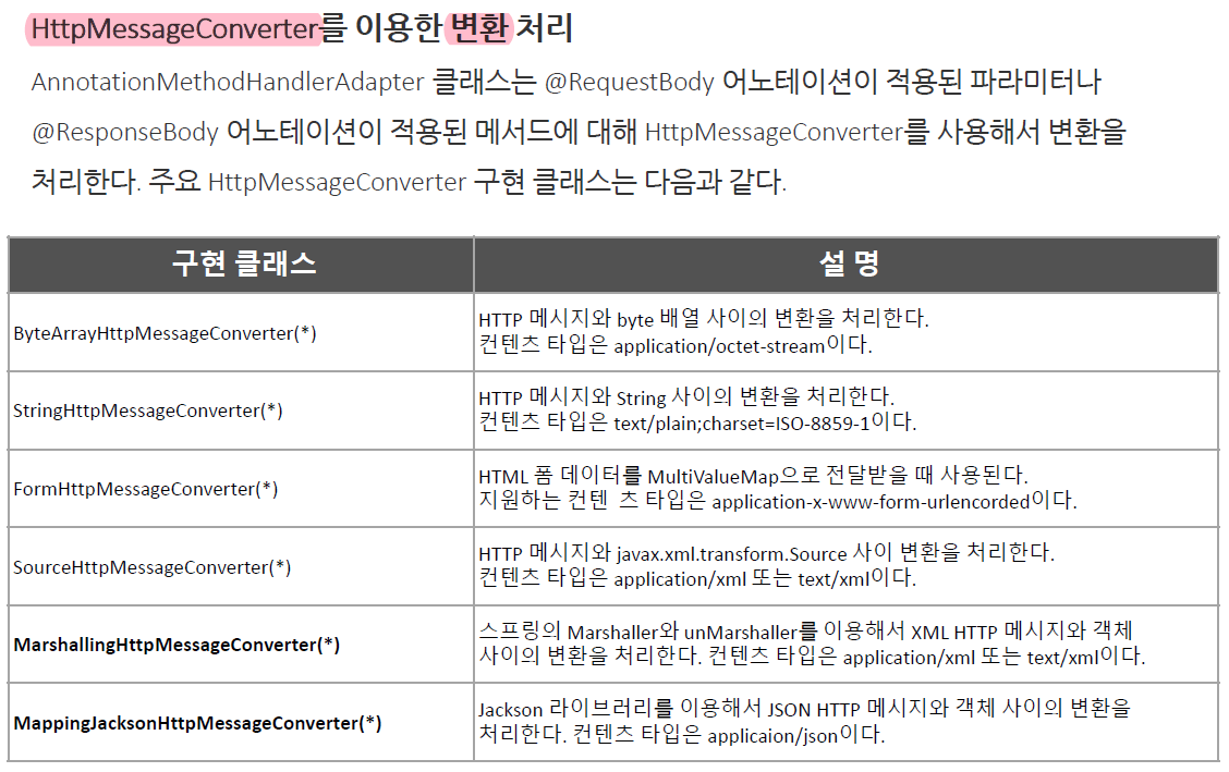 - HttpMessageConverter를 이용 → 자바객체 & HTTP요청/응답 사이를 변환처리