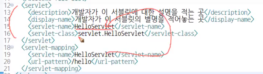 /hello 라는 경로로 요청이 들어옴 → 처리할 객체 HelloServlet → <servlet>안에 있는 객체의 정보 → 실체 처리하는 객체는 <servlet-class>의 servlet.HelloServlet에 있음 (경로)