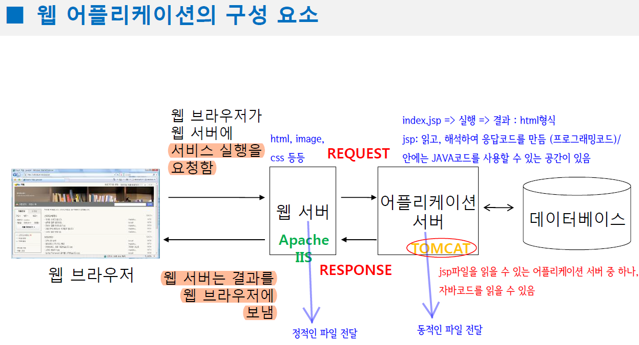 ⇒ Tomcat은 HelloServlet.java의 클래스를 참조 → HelloServlet의 객체를 만들고 service()메소드를 자동으로 호출 → 응답객체 (setContentType), 데이터를 print로 만들어서 html으로 만들어서 브라우저에게 전송