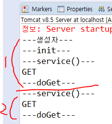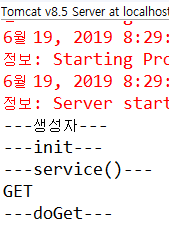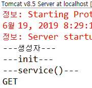 생성자, init(), service() + service()의 request.getMethod() → 콘솔에 출력됨