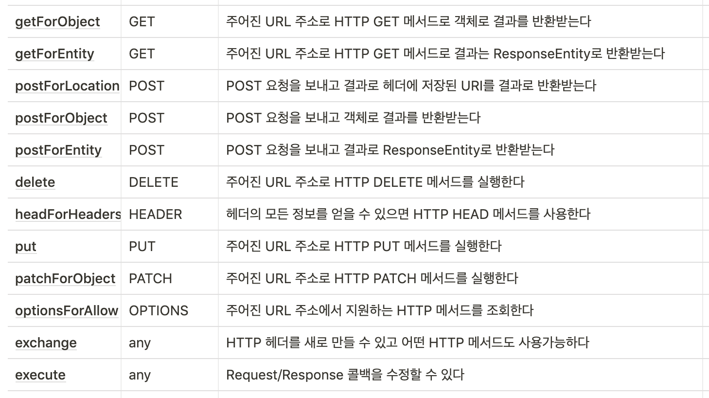RestTemplate은 스프링에서 제공하는 다른 여러 *Template 클래스 (ex. JdbcTemplate, RedisTemplate)와 동일한 원칙에 따라 설계되어 단순한 방식의 호출로 복잡한 작업을 쉽게 하도록 제공합니다. RestTemplate 클래스는 REST 서비스를 호출하도록 설계되어 HTTP 프로토콜의 메서드 (ex. GET, POST, DELETE, PUT)에 맞게 여러 메서드를 제공합니다.