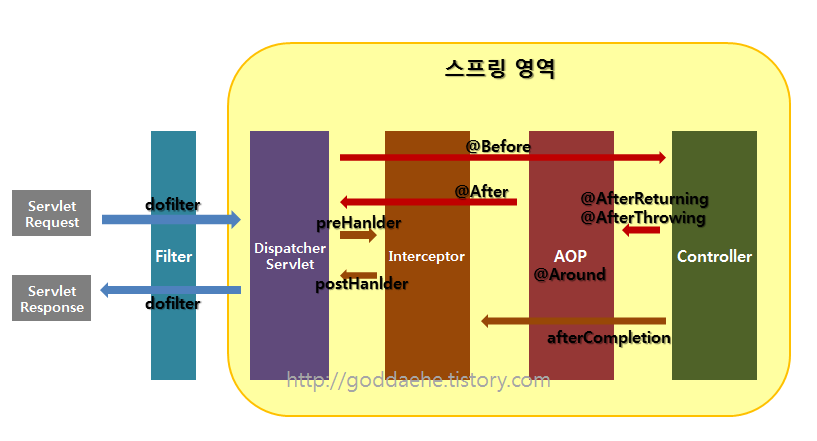 - DispatcherServlet이 컨트롤을 호출하기 전/후에 끼어듦 -> 스프링 콘텍스트 내부에서 컨트롤러에 관한 요청, 응답 처리함